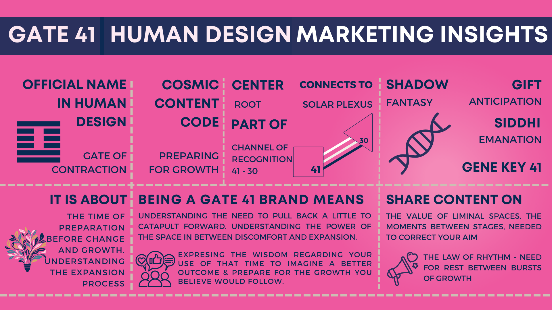 In Human Design, Gate 41 is called the ‘Decrease’ and is the gate of ‘contraction’ in traditional HD. This gate marks the beginning of the ‘True New Year’ in Human Design which is a time of new initiations. The fact that 41st is the start codon in gene keys, means that, unlike, Jan 1st, the time around Jan 21-22nd is really the time to visualize the year ahead and set intentions and goals.
